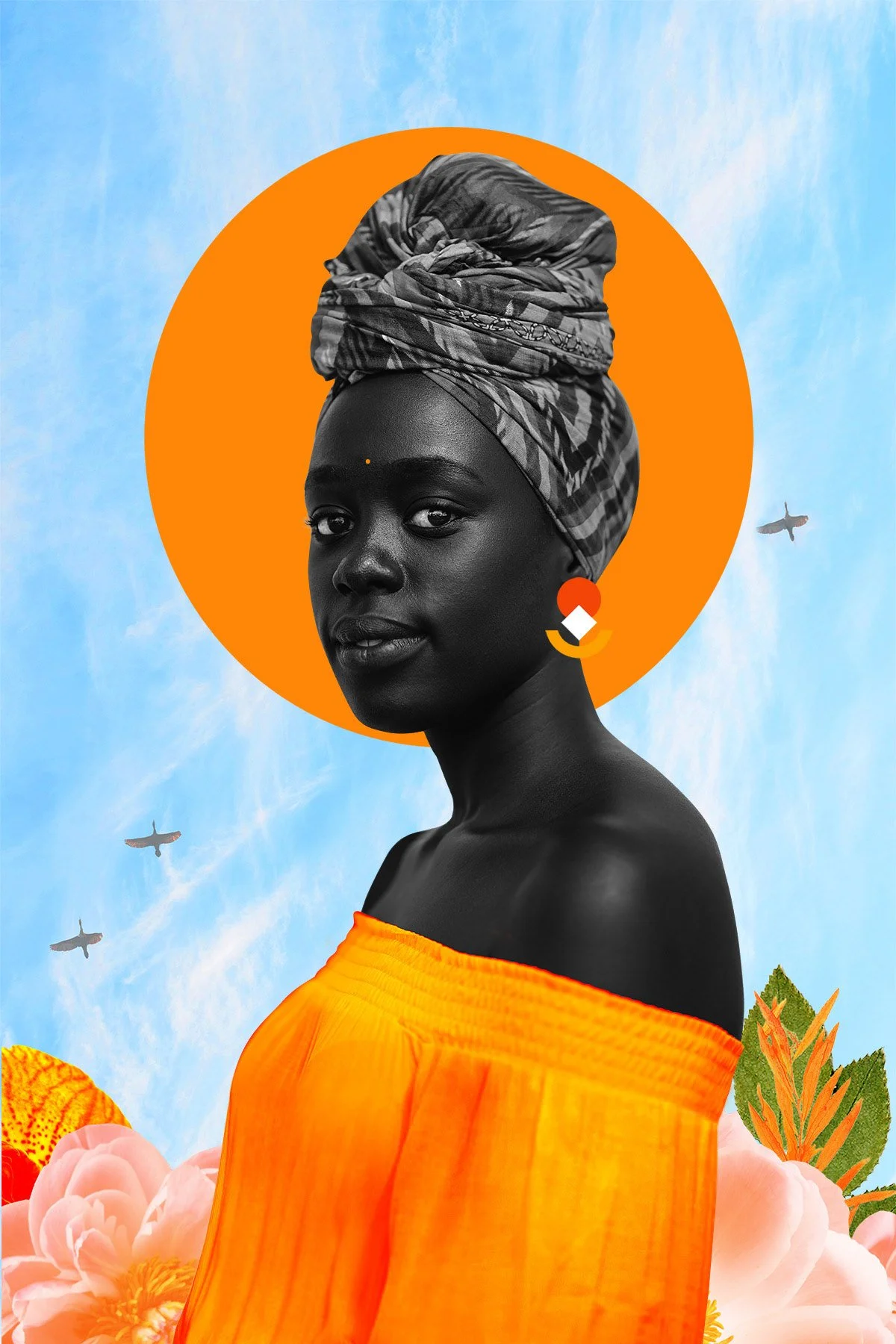 In this photograph, titled God, I present a vision that reimagines divinity through the lens of Black womanhood. At the center stands a dark-skinned Black woman, her hair covered, enveloped in a radiant orange dress that flows like sacred fabric. Behind her, an orange halo glows, echoing the iconography of saints and deities across cultures. The backdrop features a vast blue sky where birds soar freely, and vibrant flowers bloom around her, symbolizing life, freedom, and the interconnectedness of all beings.