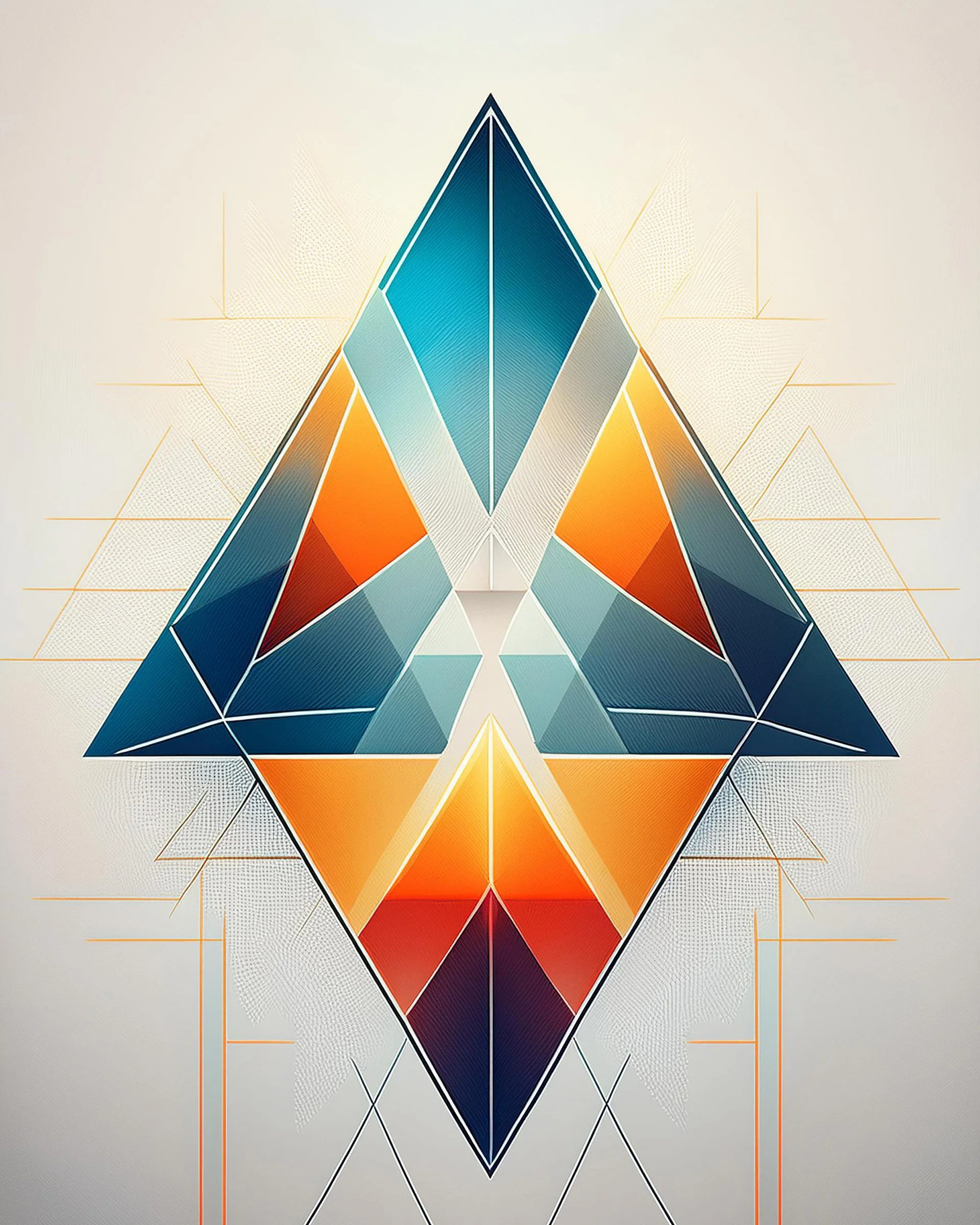 Color plays an essential role in expressing the divine. I use a vibrant palette sometimes harmonious, sometimes in contrast to evoke emotion and spiritual resonance. The colors are not just decorative; they are elemental. They pulse with life, interacting with each triangle’s size and position to suggest energy moving upward, outward, and inward all at once.